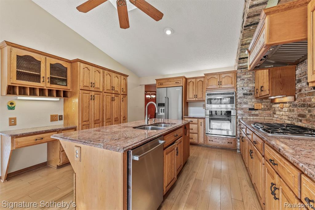 Open the front door to views thru the house to the delightfully landscaped .51 acre lot. Custom built with the needs for lots of desires here. Ceramic entry to spacious great room with a wall of windows. You will find a seated fireplace and wine cooler refrigerator and plus lots of room for comfortable seating and entertaining in the great room. Formal dining room. Primary bedroom has a walk in closet and ensuite bathroom with a heated floor! 4th bedroom has been used as an office with closet. 1/2 bath. Glamorous kitchen. Funny word to describe a kitchen but it is! Beautiful cupboards, granite counters, SS appliances, center island for snacking, talking, and eating. Breakfast table area. Doorwall to deck. Laundry on first floor. Yay! Skylight above stairs as going to second floor. Two bedrooms up with a full bath. Lower level basement has a huge family/game room with closets for storage. Pool table included. Half bath and very large work area for the the hobbyist, building and/or handy person. Extra large garage. Beautiful landscaping front and back. Sprinkler system. Coy pond. (They are in hibernation right now.) Close to I/75, Dixie Highway, Clarkston Schools, Deer Lake Beach, and the Village of Clarkston. Also Pine Knob for skiing in winter and concerts in summer. A great neighborhood and place to live. |